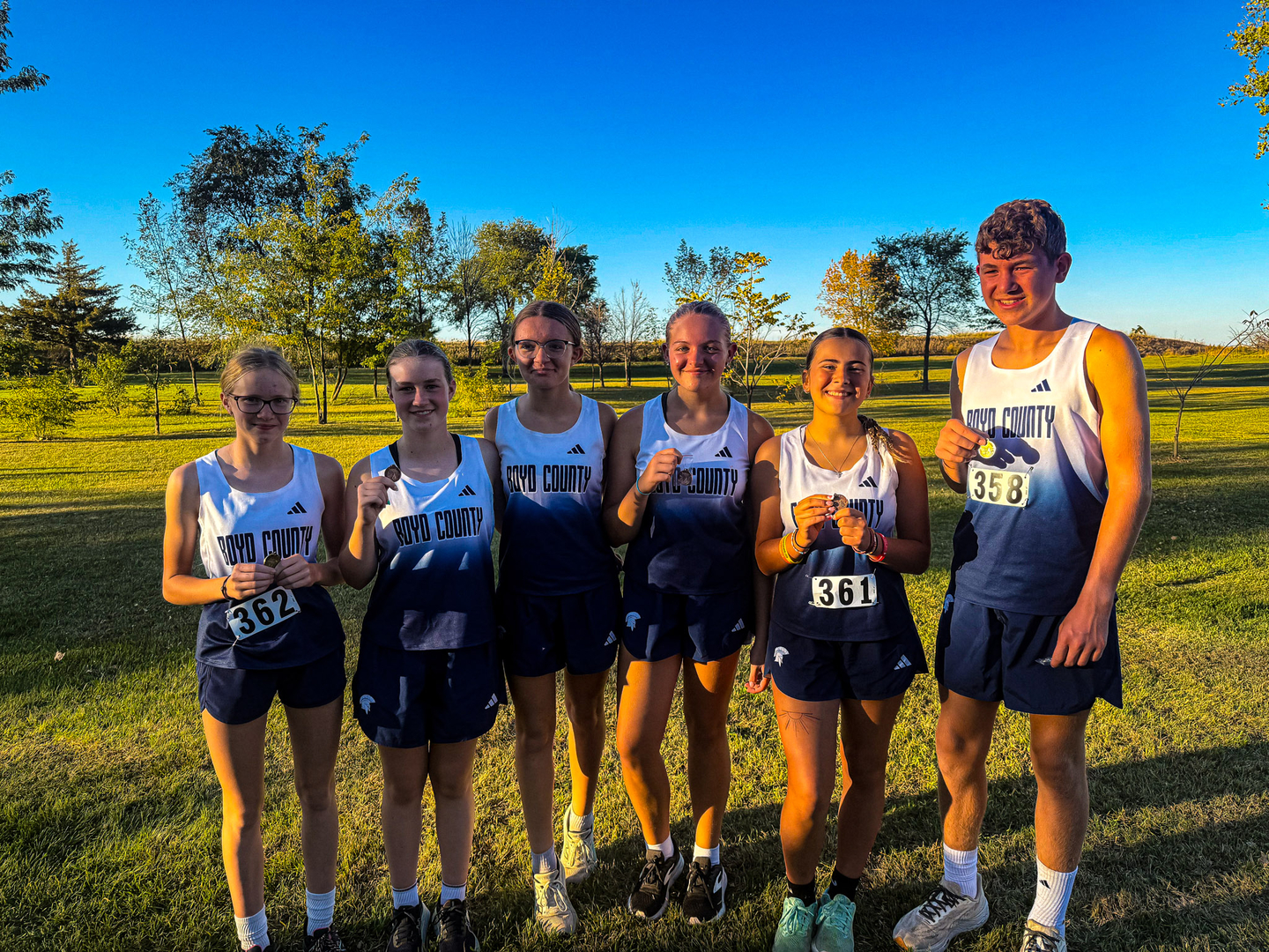 Four championship awards were brought back to Boyd County on Thursday, October 9, 2025 as the Boyd County Cross Country team returned from the Niobrara Valley Conference Meet hosted by Ainsworth. Will Nelson, senior, brought home the boys title with a time of 18 minutes flat. 7th grader Baleigh Koenig took home top honors in the junior high girls 1600m race with her personal best time of 6:37. And 8th grader Case Reiman grabbed the first place medal in the boys junior high 1600m race crushing his personal best with a time of 5:40. The fourth championship of the day was bestowed on the boys team. For the third year in a row the Boyd County Varsity Boys Team won the NVC team title. All those first places are impressive, but check out the rest of the runners. They were impressive too!