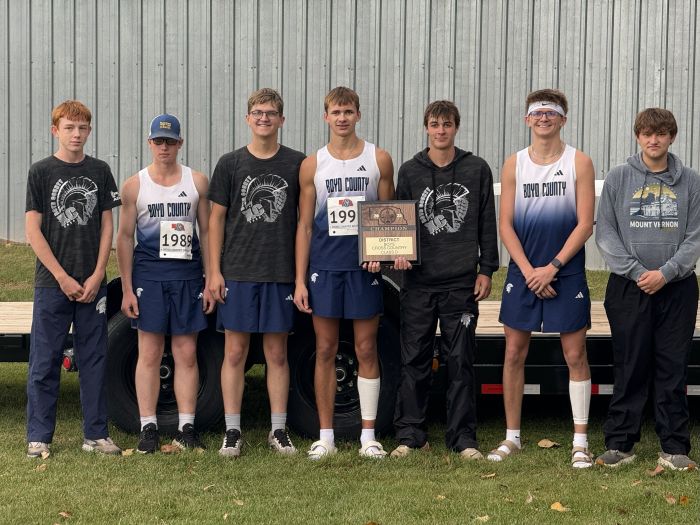 The Boyd County Boys Cross Country Team are repeat district team champions in District D3 cross country after their performance at the district meet on Thursday, October 16, 2025. Will Nelson claimed the individual championship title and three other individual Spartan runners punched their ticket to the state meet. The Spartans drove through wind and rain as they traveled to Ainsworth, but when they arrived the rain stopped, the wind calmed a little, and the Spartans were able to compete on one of the best weather days of the season, and they made good use of it!